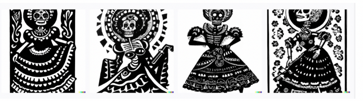 The results were impressive. Dall-E had absolutely understood what linocut was at this point. It understood the word celebration in the cultural context of Day of the Dead. It wasn't exactly in the style of Posada but it was close enough.