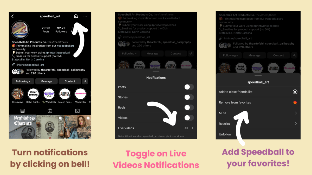 You can turn on post notifications by going to the Speedball profile and clicking the bell icon. This will bring a submenu that will allow you to toggle on which notifications you would like to see. Make sure that under Live Videos you press Get All Notifications. While you are on the profile you can click on the Following button which will bring a menu allowing you to Add to Favorites.