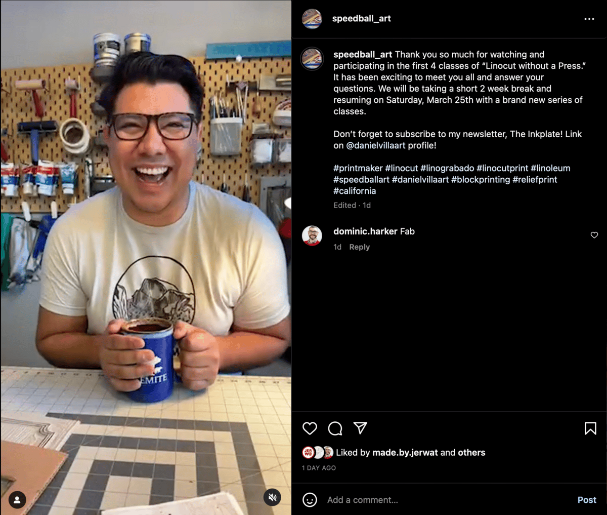 In case you missed the fourth and final Instagram live class for “Linocut Without a Press” this past Saturday, you can watch it here, and also on the @Speedball_art profile.