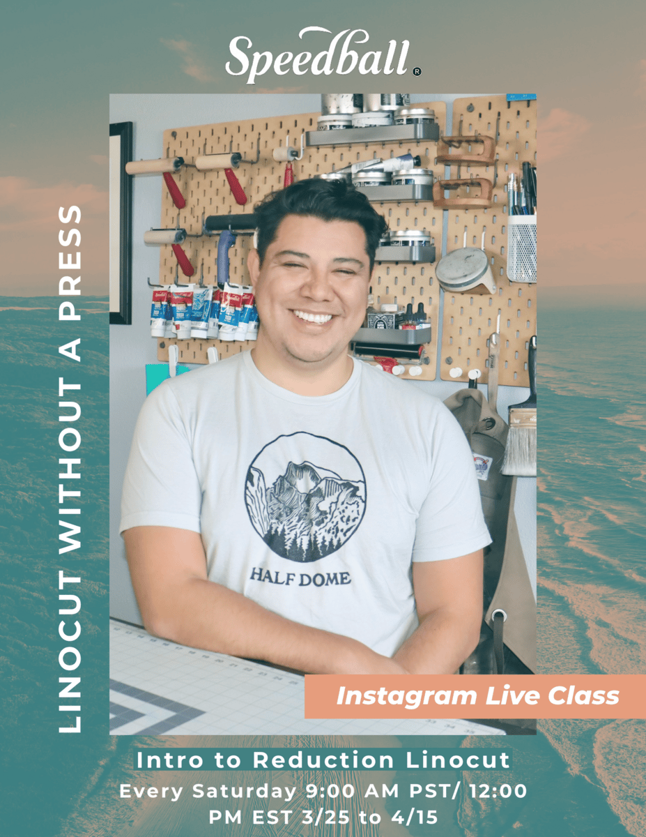 On Saturday March 25, 2023, we will start the Introduction to Reduction Linocut series! This class will also take place on @Speedball_Art Instagram profile. All live classes will start promptly at 9:00 AM PST / 12 PM EST. Many thanks and appreciation to their support and collaboration.