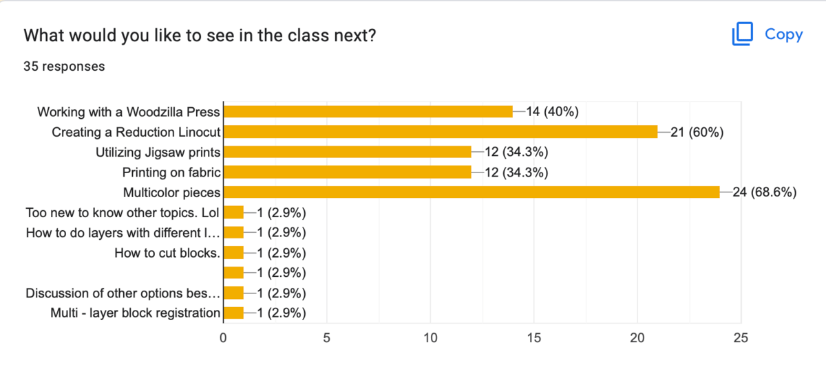 The number one topic requested for a future class was multicolor prints, followed by reduction linocut, working with a woodzilla press was third, and in fourth place were jigsaw prints & printing on fabric. Having said that….
